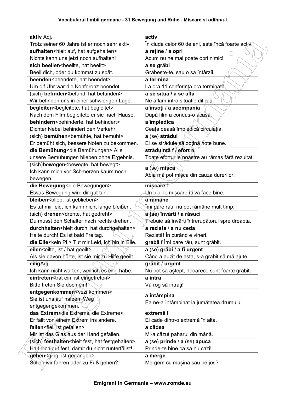 Vocabularul limbii germane - 3.1.1 Bewegung und Ruhe - Miscare si odihna |
